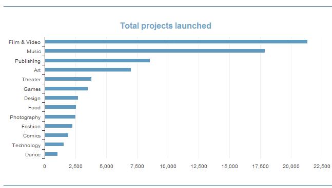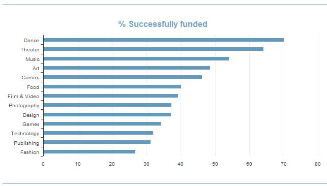 尽管舞蹈类的项目最少,但这些项目有最高的70%的成功率。Kickstarter上的项目融资额度一般在几千美元到一百万美元之间,平均值在1000-9999美元这个区间内。