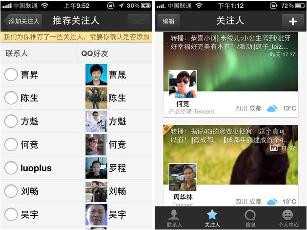 使用手机号注册一个QQ通讯录帐号,然后在应用中登陆自己的QQ 号,应用就会自动将手机通讯录中的联系人与QQ好友进行匹配,并将综合联系人姓名、朋友网中的真实姓名和电话、QQ备注名等数据给你推荐关注人。你只需要从中选择一些关注对象,就能够在“关注人”中看到他们在腾讯微博发布的内容更新。