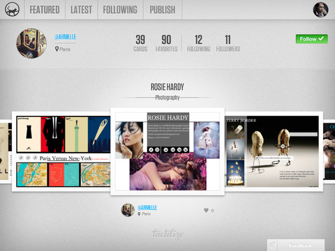 具体说来,Tactilize 希望让作者、摄影师以及其它任何对生产内容感兴趣的人非常简单的做出好的内容,并且可以通过出售自己制作的内容获得收益,进而形成一个自出版平台。通过Tactilize 发布的 iPad 应用,可以将文字、图片、声音以及视频制作成为交互式内容,它本身也会提供很多模版。同时存储在 Dropbox、Google Drive、Evernote、Facebook 以及 Flickr 等网络的文件也可以非常容易的上传到 Tactilize 上,作为制作出版内容的来源。