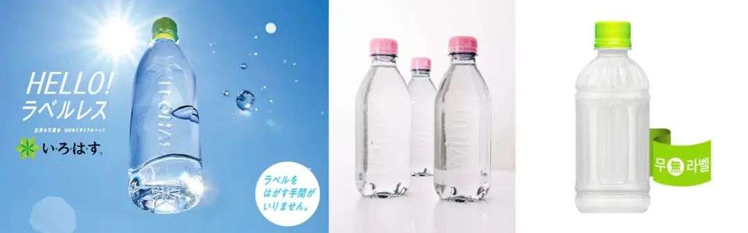 日本的饮用水品牌 I LOHAS,法国的矿泉水品牌依云,韩国的碳酸饮料品牌 Seagram’s、饮用水品牌江原平昌水、运动饮料品牌 Toreta 都曾推出无标签包装。