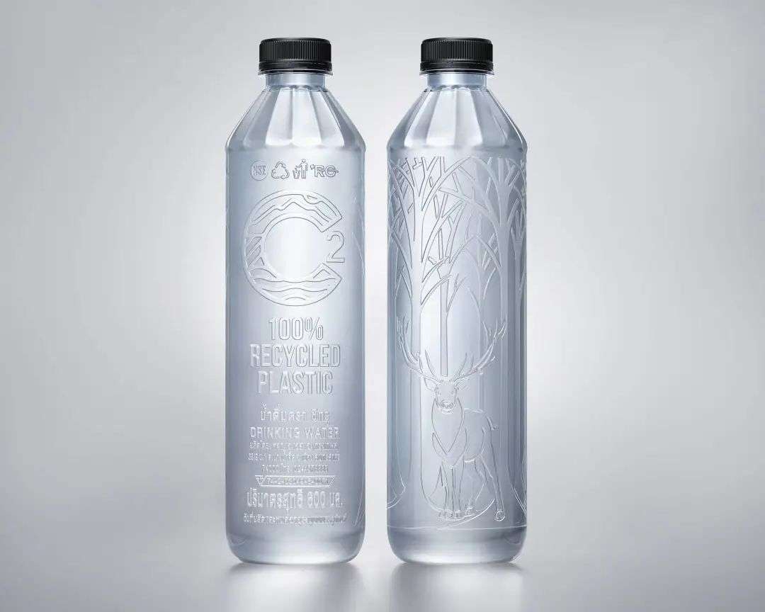 泰国矿泉水品牌 C2 的无标签 PET 瓶,瓶盖附有条形码,产品信息压印于瓶身,与森林中的鹿、雪地中行走的北极熊、天空中飞翔的鸟遥遥相望。
