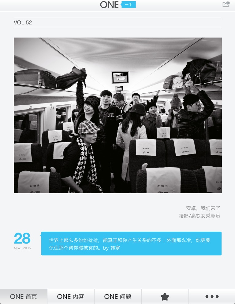 iOS 平台后,韩寒的《ONE·一个》App 今天正式登陆 Android 平台。