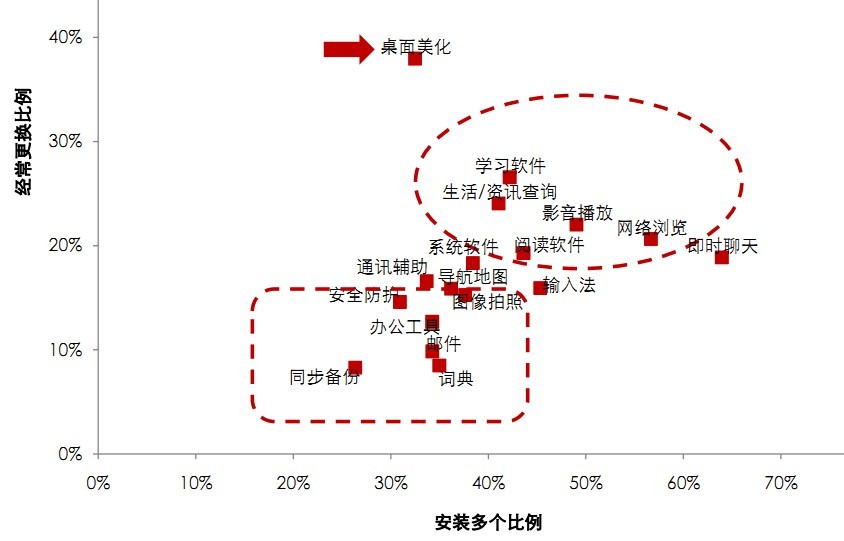 游戏娱乐类的APP流动性最强,安装多个、频繁更换比例均为最高。对手机功能补充扩展并且其功能可以脱机使用的APP忠诚度尤其低,比如桌面美化、影音播放、网络浏览、阅读等,需要服务商持续提供服务的APP产品,如导航地图、安全防护、办公工具、邮件、同步备份等则相对稳定。