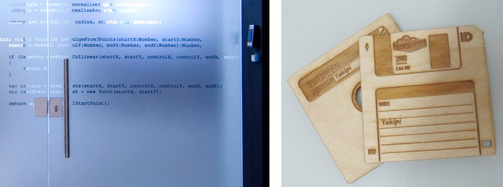 (你不需要一家华丽的办公室来留下美好的印象——细节往往决定成败。我们的入口就贴着代码,我们的定制杯垫则做成了磁盘的形状)