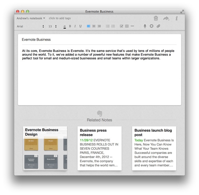 另外还新引进了一个相关笔记功能(如上图),当你新建一条笔记或者查看一条现有的笔记时,相关笔记会在笔记底部显示出来。输入的内容越多,笔记相关性就越大。这些相关笔记可能来源于你自己的帐户,也可能来源于同事们的企业笔记本。Evernote 官方声称,这个功能有史以来第一次实现了: