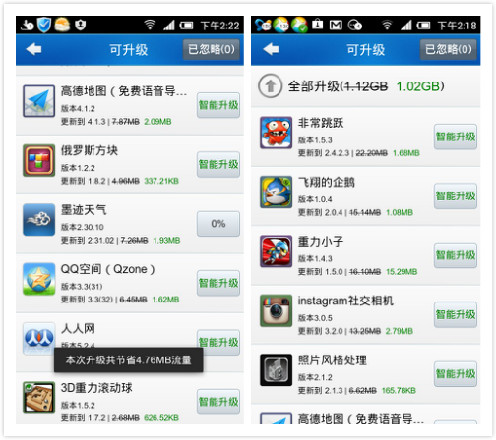 像我更新“墨迹天气”这个应用(上图)时,完整版大小为7.26MB,但通过智能升级只需下载1.93MB就可以了,而遇到有更新的应用时都能在后面看到“智能升级”的提醒。