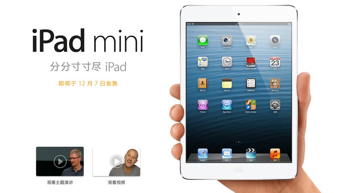 同时,大家所关心的iPad Mini也将和iPad 4一起发售。iPad mini 将同样推出黑色和色版本两个版本,16GB官方售价为人民币2498元,32GB为人民币3288 元,64GB为人民币4088 元。iPad mini最大的特点就是采用了7.9英寸屏幕,较第三代iPad薄了23%,轻了53%,配备了500万像素 iSight摄像头,可以实现长达10小时的电池续航。