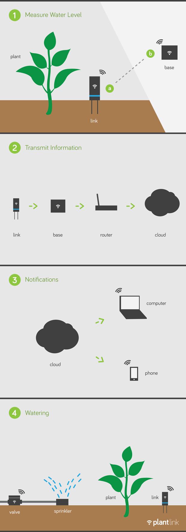 Plant Link的系统主要包含这几个部件:侦测器Link,插在植物旁的土壤中,监测土壤中的水环境并将数据发送到基站base,然后基站base将数据上传到云端的服务器,Plant Link就会在需要时给用户的电脑或者手机发送提醒。如果用户不方便自己动手或者懒得不能解释,还可以发送指令,远程操控智能阀给植物浇水。
