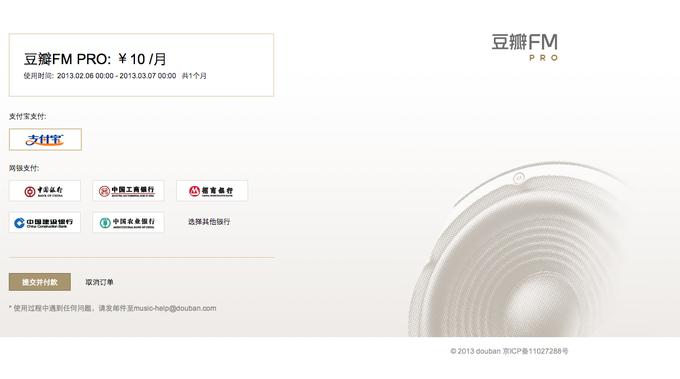 今天,豆瓣FM推出了付费版本:豆瓣FM Pro。定价分为10元/月和50元/半年两种模式,用户可以选择一次购买单月或半年两种方式。Pro版将提供高音质和无广告两项服务,可以通过支付宝和网银付款。