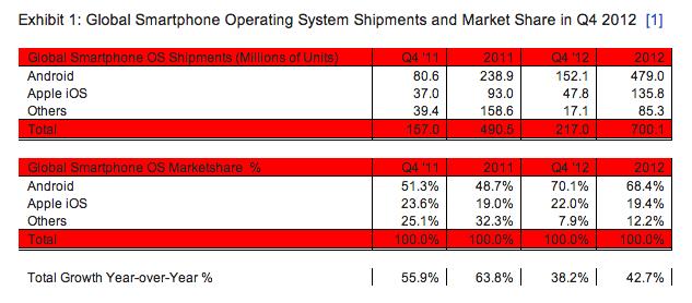 Android+iOS豪取2012年Q4全球智能手机出货量的92%,Android是“无可争议的销量老大”