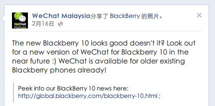 BlackBerry 10发布已经有一段时间了,目前国外的主流应用基本都支持这一新平台,由于还尚未正式进入中国,因此国内众多的流行应用均未发布官方的BlackBerry 10版本。不过最近微信的马来西亚官方Facebook发布了一则消息,称全新版本的微信即将到来,而且微信已经支持现有的黑莓设备。