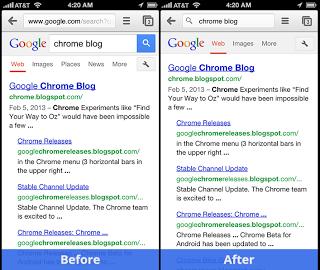 iOS版Chrome带来三个改进,一个是omnibox,以后搜索的关键词将会取代地址栏中的一长串的URL,支持直接在地址栏里随时修改关键词。不过这功能要在几周后才推出,所以即便现在升级了iOS版应用也是看不到变化的。如下图: