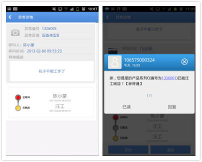 异呼通的app功能如下:工厂工人通过移动终端向有关负责人上报异常类型,比如设备宕机、生产线缺料等等,系统将异常通知以短信形式推送给负责人。负责人此时可对异常进行响应和处理,异常提报人也会收到短信,告知异常已在处理,并可对最终的处理结果进行评估(包括服务评分和损失工时)。