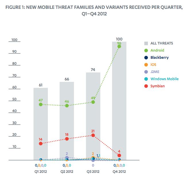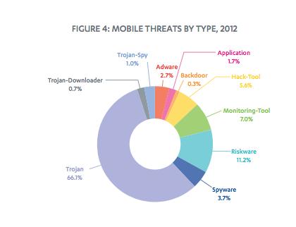 Andorid是全球最流行的智能机系统,因而树大招风?还是Android的防御性太差,因而容易受到攻击?来自芬兰的防毒软件公司F-secure公布报告显示,2012年Andorid平台上的流氓软件占到总量的79%,高居榜首(2011年为66.7%,2010年则仅为11.25%)。相比之下,排名第二的智能机系统iOS平台则延续了一贯的优良作风,流氓软件仅占总量的0.7%。