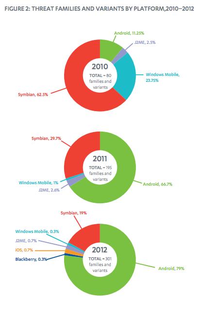 市场份额不断下滑、被亲爹诺基亚抛弃的塞班平台上,流氓软件比例降至19%(两年前为62.5%)。F-Secure预测到2013年,伴随着用户向Android平台的转移,塞班上的流氓软件将销声匿迹。另一方面,Windows Mobile,BlackBerry以及J2ME上的流氓软件比例也都低于1%。