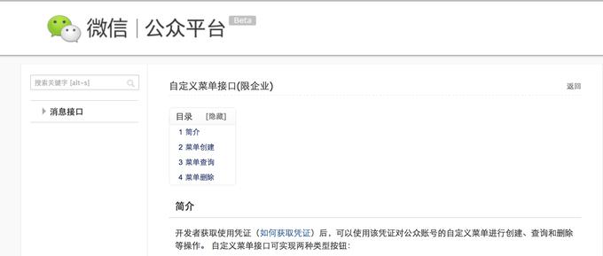 今天Tech2ipo报道微信已经正式对外开放了自定义菜单的接口,这里是接口说明文档。我们和微信联系,微信称接口还没有正式公开,他们还在考虑。不过文档确实是自定义菜单接口的文档,只是缺了一些关键信息。