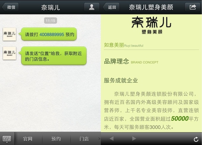 除了常规的通过对话与用户互动之外,自定义菜单让微信号添加了相当于导航的功能。比如上图的点击官网查看奈瑞儿介绍。