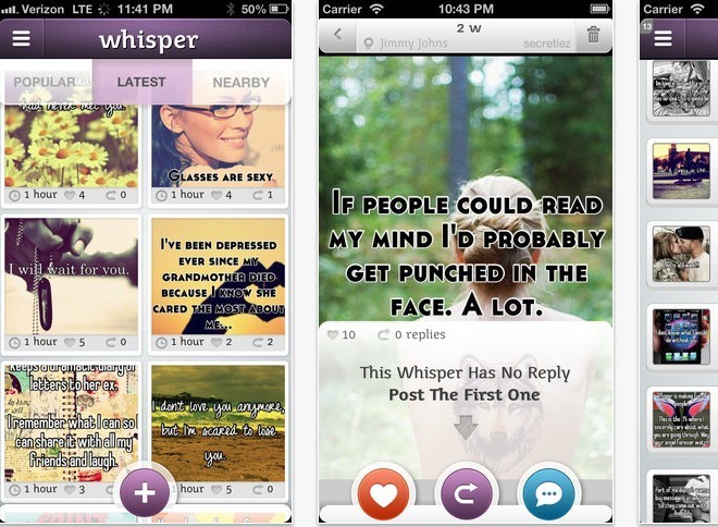 Whisper是一款移动端的树洞类应用,在美国的学生群体中很火。同其他树洞不同的是,用户在Whisper上的说出的秘密不是单纯的文字或者图片,也不是图片配文字描述,而是内嵌有文字的图片。这些图片可以是你过去或者现在拍摄的,也可以直接从网上搜索的来,然后在图中写上你想说的秘密,就成了一段Whisper。别人可以对它标心,也可以用同样的形式——内嵌文字的图片进行回复。