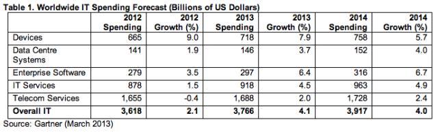 水静深流:Gartner预计2013年全球IT开支将稳步增长至3.8万亿美元,但移动将推动开支构成的剧变