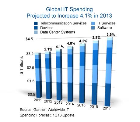 分析机构Gartner发布了最新的全球IT开支预测报告,认为2013年全球的IT开支将达3.8万亿元,比2012年上升4.1%。这个增长率与去年的2.1%相比几乎翻了一番,显示出IT业从衰退中复苏的迹象,Gartner认为该趋势仍能维系到2014年。Gartner的IT开支分析主要包括硬件、软件、企业和电信领域。移动和企业服务是开支增长的主要推动力,PC和语音服务开支则出现下降。