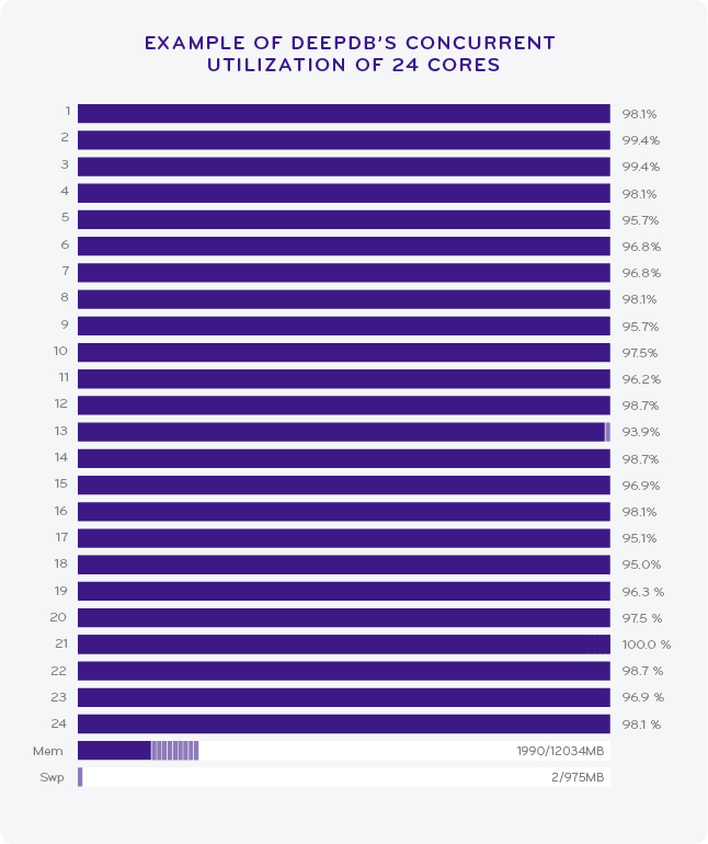 从下图可看出,DeepDB对多核CPU的利用率保持在93%以上,且对内存的占用很少。