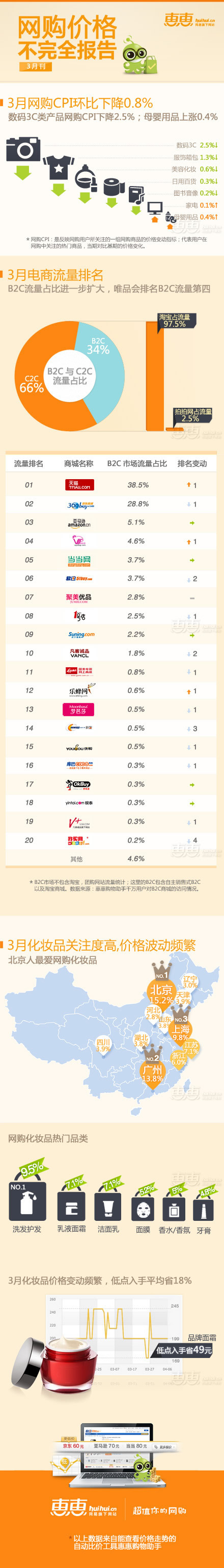 惠惠网今天发布了2013年3月份《网购价格不完全报告》,报告统计了274个商城的30余万商品在2013年3月份的公开信息。结果显示,3月网购CPI环比下降0.8%,3C类商品的平均价格下降最多。3月份B2C的市场份额继续增加,流量占比达到了34%,上涨了4个百分点,唯品会首次进入B2C流量排名第4的位置。