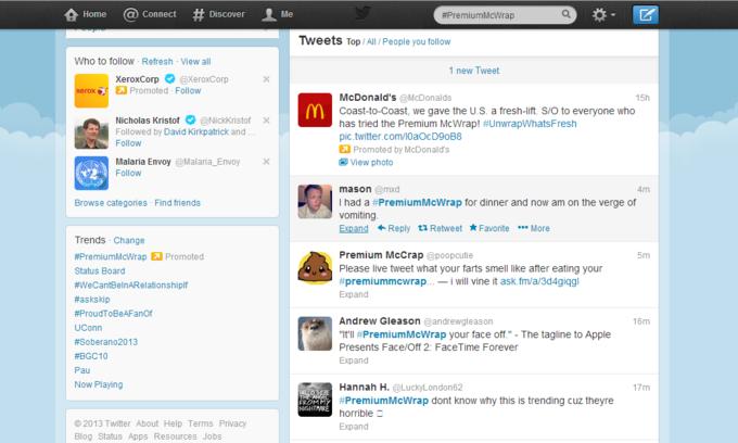 但为什么人们明明知道是广告这个话题还会火呢?很简单,如果今天有一个关于麦当劳食物的话题#PremiumMcWrap,而你又恰好遭受过其恶劣的服务,自然会忍不住去吐吐槽。并且这种生活话题的讨论几乎没有门槛,一来一回楼就盖到几十层了。而且聪明的广告商们已经掌握了Twitter用户的使用场景——他们通常是陷在沙发里,一边考虑吃什么玩什么一边刷着Twitter,娱乐和食物广告的到达率自然会很高。