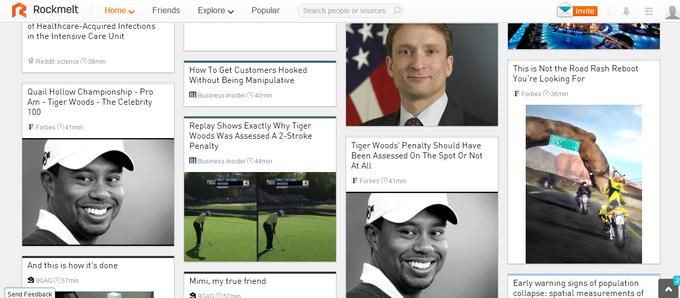 Rockmelt在过去几年的经验教训就是不断地试错,找出有效的保留,然后将不起作用的摒弃。既然社会化浏览器的努力不算成功(450万的下载量显然不算太大),那么这一次重返桌面他们索性不做客户端,直接做网站。典型的浏览器一般都是输入URL或执行搜索查询来访问网站,而Rockmelt则是不断地变换着一张张的“瓷片”—朋友推荐的网站、RockMelt根据用户喜好推荐的网站分别被缩略到一张张的瓷片上,这些瓷片会时不时变换,用户看到感兴趣的点进去就行了。