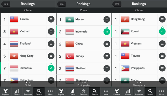 左:拼立得在各区域AppStore的总榜排名;中、右:拼立得在各区域AppStore的摄影榜排名(数据来源:appstatics)