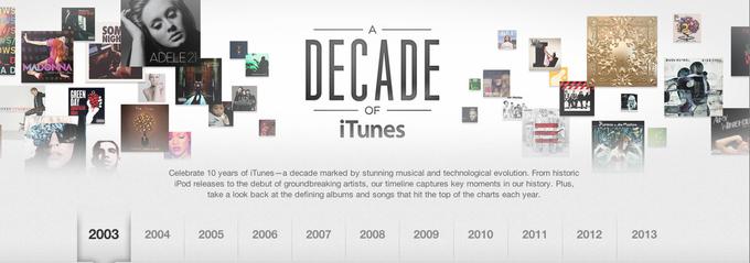 为庆祝iTunes诞生十周年,苹果专门制作了一个iTunes大事记专题,以时间轴的形式,呈现了iTunes的成长历程。页面内容包括年度十大金曲、最佳专辑以及发布Windows 版等里程碑式的事件。