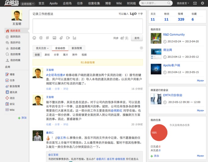 企明岛是专业的企业社会化协作平台。提供:免费版本、收费版本、私有化部署版本。目前已在提供的主要服务有:企业微博、项目管理、CRM管理、会议管理、博客、WIKI协同、企业通讯录、任务管理、新浪微博、iPhone与Android客户端等。微博是企明岛的核心基础,基于此构建出适合不同场景所需要的企业Apps,如关注于任务进度管理的任务Apps,关注于结构化知识系统展示的文档Apps,关注于个人PKM管理的博客Apps……。同时企明岛还提供iPhone与Android客户端,可随时随地接入到企业空间中,根据自己的需要选择Apps,快速的定制出适合于自己企业的社会化协作空间。