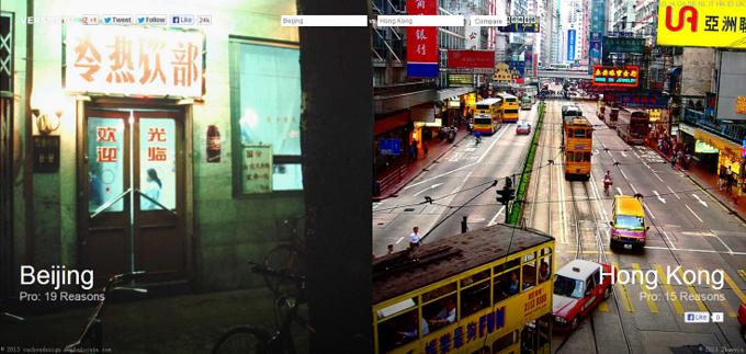 假设你通过 VERSUS IO 对比北京和香港,它会告诉你选择北京的 19 个理由,比如北京的男性比例(对单身女性而言是个福音)等;还有选择香港的 15 个理由,比如这座城市里的亿万富翁更多。VERSUS IO 给出的信息就是如此的详细和出人意料,绝对能提供丰富的参考价值。