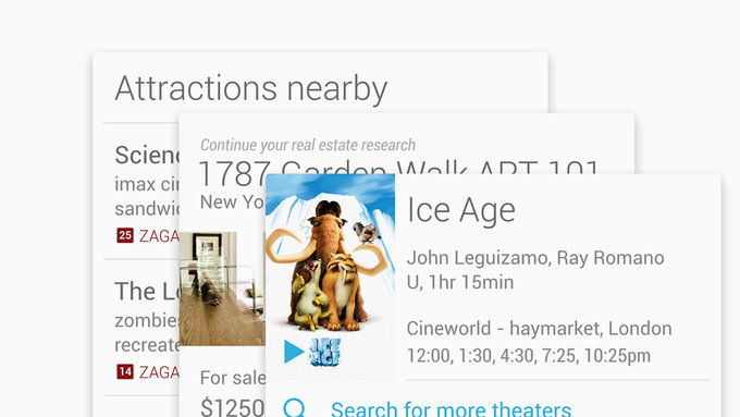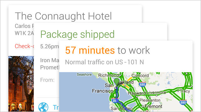 我说:“大量信息连续性推送的问题从移动互联网出现第一天就存在了,当然早于最近几年才流行的触屏设备。”所以不难理解,当谷歌工程师们面对Google Now提出的设计挑战时,为什么选择卡片了,它既可以单独开来灵活使用,又可以组成一组来传递那些大量的或者有连续性要求的信息,并且在表达上能呈现出整体一致的效果。