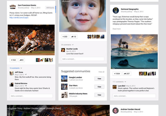 虽然我本人不建议诸位纠缠于细节,但不可否认,正是这些细节确保了不同的内容在一块屏幕上和谐相处,而且放置卡片的“栏”的概念也值得表扬。它从容的适应不同尺寸的屏幕上,同时还保证着用户体验的一致,比如,在笔记本上,Google+可以在同一时间显示三栏卡片;而在手机上可以一次显示一栏卡片,而这并不影响卡片的使用效果。