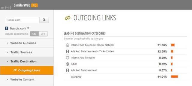 但现在,我们应该能获得一些答案。据网络测量公司SimilarGroup的分析,Tumblr访问量最大的20万个域名中,有22,775个域名属于成人网站,占到总数的11.4%。SimilarGroup公司今年早些时候筹得2500万美元,意欲与Alexa在网页排名领域展开竞争。同时,SimilarGroup公司对这些成人子域名分析后发现,Tumblr 6.6%的访问流量来源于此。此外,Tumblr 22.37%的外链导入也是通过这些成人网站完成的,这已经成为网站推介的主要渠道。同时,Tumblr出站流量的8.02%是转到成人网站的。