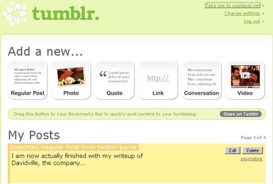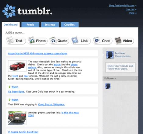 今年三月,在Austin会议中心举行的西南偏南互动会议上,David Karp向座无虚席的观众重述了他创建Tumblr的故事:“我想为我自己提供一个那样的分享平台,我想在上面塑造一个让我感到自豪的身份。我尝试了当时极富盛名的博客工具——WordPress和Blogger,以及照片分享平台Flickr和视频分享平台YouTube,它们都没法使我满意。它们固有的限制让我感到沮丧。”