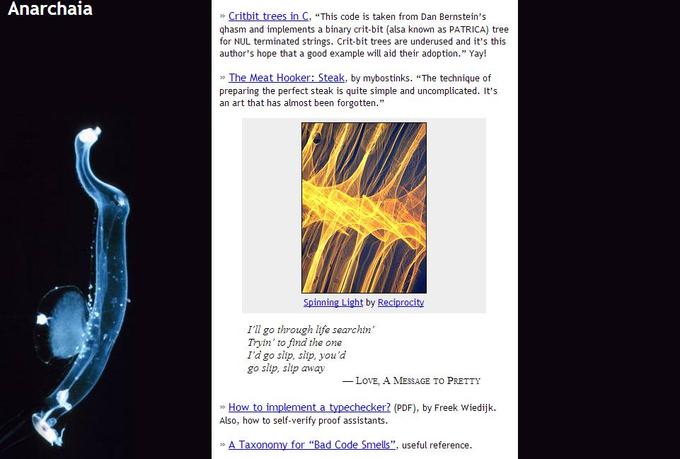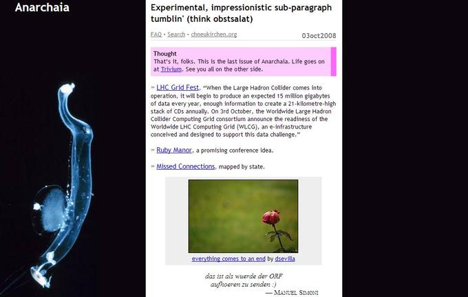 网站设计极为简单,包含了一个按年月归纳内容的存档系统。网站的中间区域则是一个用来发布内容的的大块白色栏,这个特点与第一代Tumblr的dashboard非常相似。发布在anarchaia上的博文形式自由,唯一的规矩就是将编辑内容控制在一个段落之内。内容通常是Neukirchen认为有趣的文章的引文或是链接、朋友之间的网上聊天室聊天记录以及Neukirchen在网上看到的随意的图片,全部堆积在一个换行符和小时间戳之上。