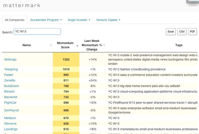 Mattermark是一款数据分析软件,它从Twitter、LinkedIn、AngelList、CrunchBase以及新闻网站中导入数据,帮助投资人发现一些潜在的机会,比如可以根据一间创业公司在社交网络上的热度帮投资人预判哪家公司很有可能突然火起来。另外也可以为长期投资人持续跟踪一家创业公司的成长状况。