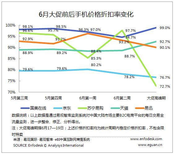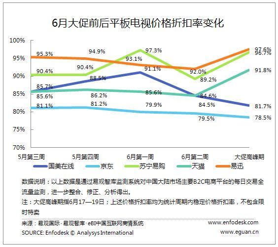 平板电视价格折扣率基本保持在8到9折。其中,苏宁易购、天猫、易迅网打折力度较大的时间段主要集中在6月第二周,国美在线、京东商城则在促销高峰期达到最低价格折扣率。其中,京东商城的平板电视相对其他几家,一直保持最低价格折扣率。