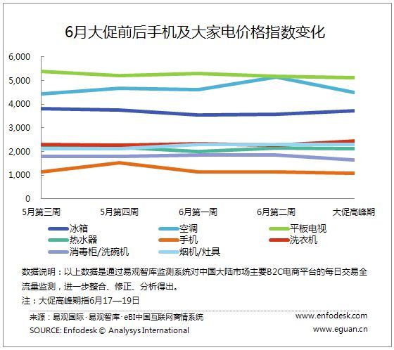 针对此次大促,易观智库选取手机及大家电品类进行全流程监测,具体价格指数见下图。从监测结果来看,除空调价格指数波动较大外,大家电的价格指数波动多在200左右;手机价格指数波动相对较大,达442.2。总体来看,进入6月,冰箱、平板电视、热水器价格指数有所走低,其中,平板电视在促销高峰期价格指数达到最低值,但冰箱、热水器的价格指数在促销高峰期时则有所上扬。