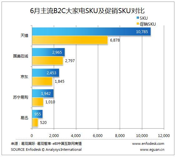 伴随着房地产市场的回暖及夏季的到来,大家电逐渐进入消费旺季。天猫电器城为了提升竞争力,采取了售卖补贴的策略,调动商家参与此次价格战的积极性。易观智库通过对主流B2C大家电SKU的监测发现,天猫虽然在大家电SKU总量上占有绝对优势,但是促销品类的覆盖率仅为63.8%,远低于国美在线及京东商城的促销覆盖率。国美在线依托线下积累的供应链优势,联合品牌商开展“品牌老板派发礼券”的活动,在大家电品类展开大规模促销,促销SKU覆盖率高达94.3%。京东商城依托强大的供应链控制能力,大家电促销覆盖率达到75.2%。
