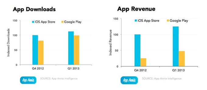 下图为今年第一季度Google Play与App Store的数据对比,图源:App Annie