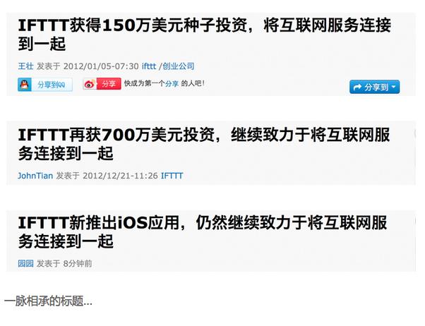 IFTTT自问世起,发展至今能够获得广泛关注和成功,这同他们一以贯之的“致力于将互联网服务连接到一起”之精神是分不开的,你很难找到第二家公司每次发布新品,告诉你它背后的做事逻辑时,都说的是同一件事儿,好吧哥们儿,就算是同一件事儿,你也得学着换个说法儿啊,你看看我们过去报道你时起的标题.......
