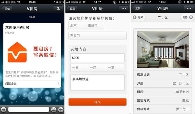 "V租房"搭建微信租房平台,让租房人发起求租需求并接收合适房源回复,提高租房效率