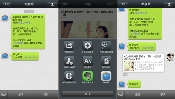 在上个月发布的新版手机QQ浏览器中,就已经内置了“微收藏”的功能,支持将手机网页进行收藏,方便稍后阅读。此次则是直接推出公众账号,支持将微信的内容也保存到“微收藏”中。可能是由于这样的功能需要获取微信系统层面的API,目前除了印象笔记和“微收藏”外,好像还没有其他的账号能够实现类似的功能。