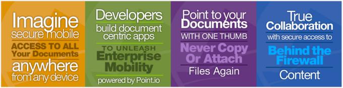 以需要处理大量敏感信息的医疗保险和金融类公司为例,绝大部分数据是绝对不能在没有安全保证的情况下被随意传播的。然后工作人员们又随时随地使用这些数据,因此把计算机作为唯一一种资源入口是十分不便的。在Point.io的帮助下,公司的软件系统可以通过RESTful API接入现存的、已针对各企业防火墙优化过的服务来管理数据。因此,Point.io与Box、Dropbox、Amazon Web Services和Google Docs这类的云端存储产品是共存而非竞争的关系。文件依旧存在原先的地方。Point.io表示他们的服务安全地和现存系统结合。