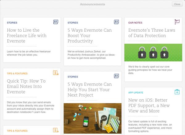 另一个重要改变是同Skitch的整合,安装了Skitch的用户,可以直接在Evernote 应用中对pdf文档进行涂鸦式的编辑。新增的“Announcements(公告)”功能,则是方便用户查看由Evernote发布的新版更新信息以及一些操作指南等等(如下图)。