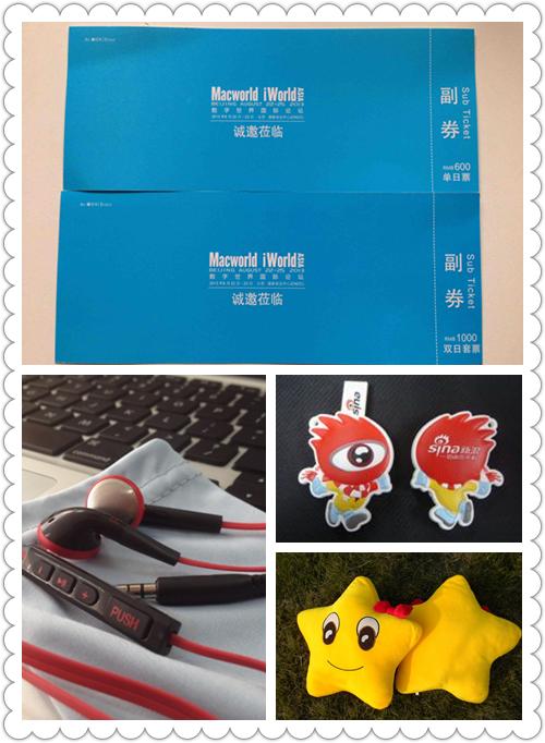 1、Macworld 大会(2013年数字世界亚洲博览会)双日门票20张,价值¥1000/张 (这次大会于2013年8月22日-25日在国家会议中心举办 )