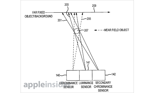 这项专利里的感应器布局将在目前广泛采用的感应器布局方式上做出提升,即在亮度传感器两边分别安排一个色度传感器,前者负责相片的光照水平而后者负责精确地收集色彩信息。这样安排下的两个色度传感器可以覆盖彼此的盲区,从而提升不同情景下的色彩表现力。另外,通过双色度感应器收集到的丰富信息也为自动校正失真带来一定的帮助。