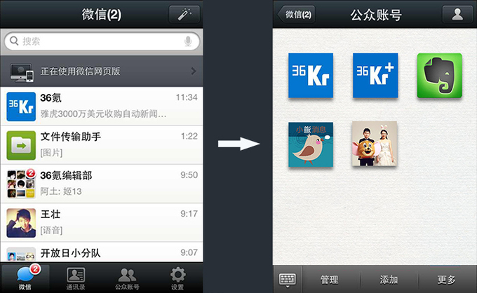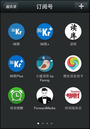 不知道你会不会对通讯录中的公众号集结方式看着有点眼熟。快5个月前,36Kr在谈微信5.0可能带来的改变时,曾设计过一张图,把微信的公众账号排列成iOS中的应用形式,就像下面这样: